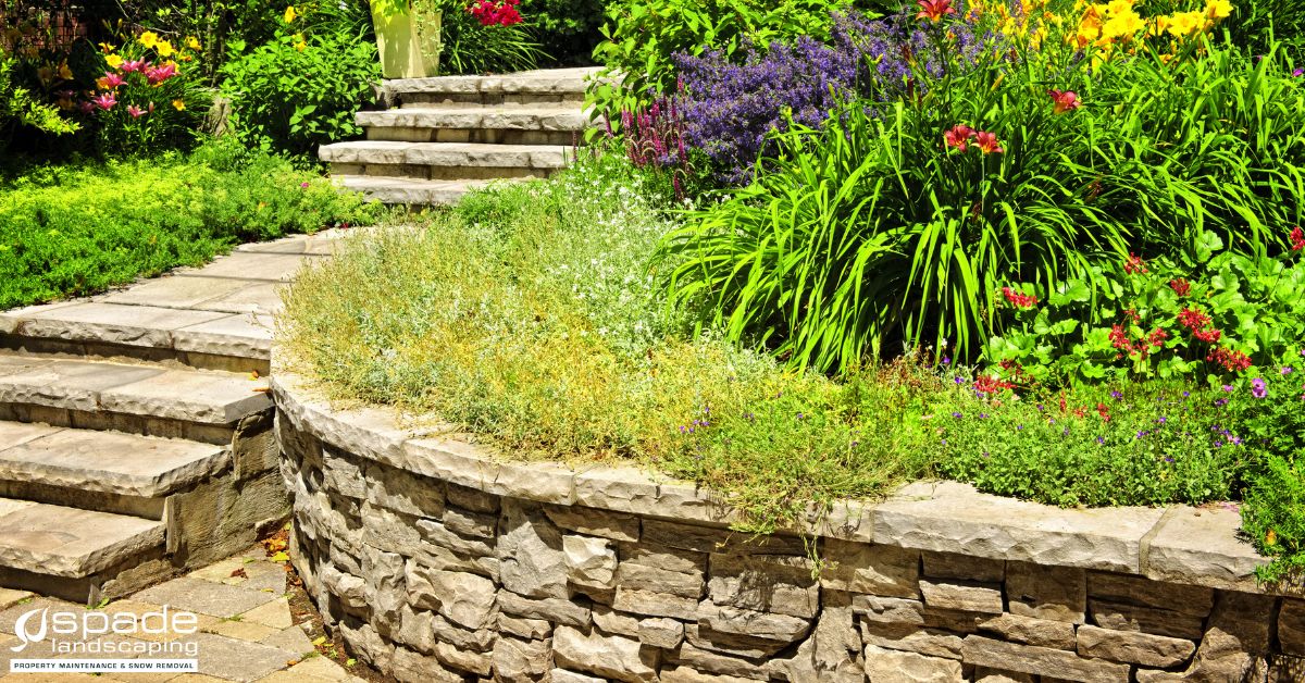stone retaining walls with flowers and plants - Spade Landscaping commercial landscaping services