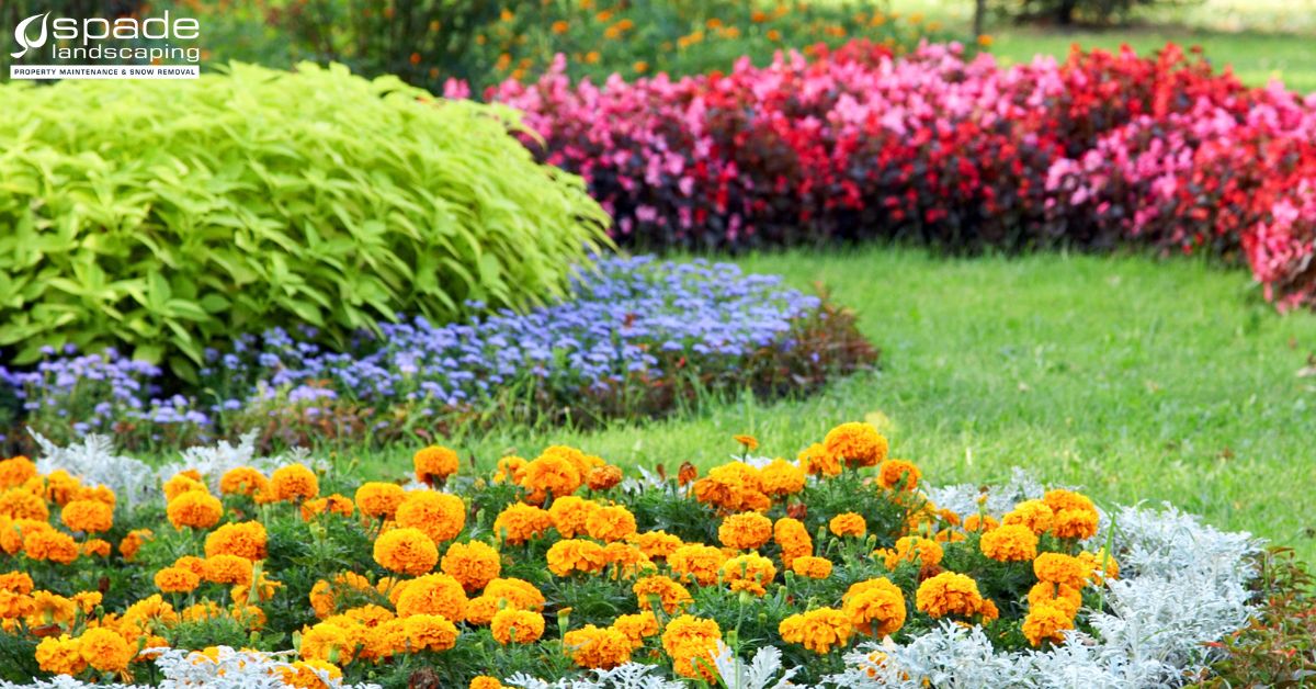 multiple plant beds with multi colored flowers - Spade Landscaping commercial landscaping servicesTo ensure year-round visual appeal, professional landscaping services offer seasonal plantings, selecting plants that bloom at different times of the year. This strategy guarantees a consistently vibrant landscape, providing employees and visitors with ever-changing sights and a sense of vitality. Moreover, an efficient irrigation system is crucial for maintaining a healthy landscape, particularly in drought-prone areas. Landscaping professionals design and install systems that minimize water waste while ensuring proper hydration for lawns and plants, allowing businesses to enjoy a beautiful landscape without incurring excessive water usage or costs.